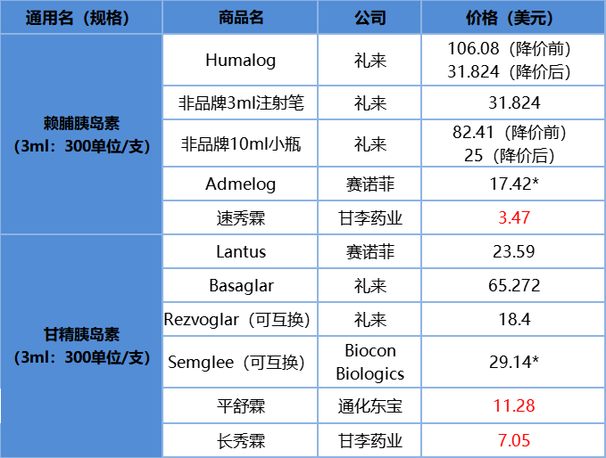 本次降价后,礼来品牌赖脯胰岛素Humalog(3ml:300单位/支)的价格为31.8美元,与非品牌注射笔单价相同,而10ml小瓶的价格降至25美元。国内集采中标的国产赖脯胰岛素仅甘李一家,速秀霖(3ml:300单位/支)的中标价为23.98元(3.47美元),显著低于美国同类产品。