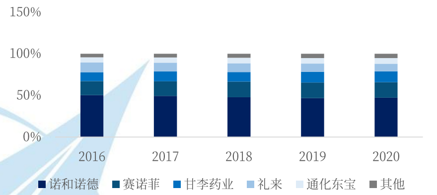 以美国为代表的全球胰岛素市场洗牌是充分商业竞争的结果。如果把目光转回到中国,胰岛素市场的洗牌在带量采购政策的驱动下来得更加直接和猛烈。在中国,胰岛素市场此前主要被跨国药企诺和诺德、赛诺菲、礼来占据,而本土企业仅甘李药业、通化东宝占据少量市场份额。