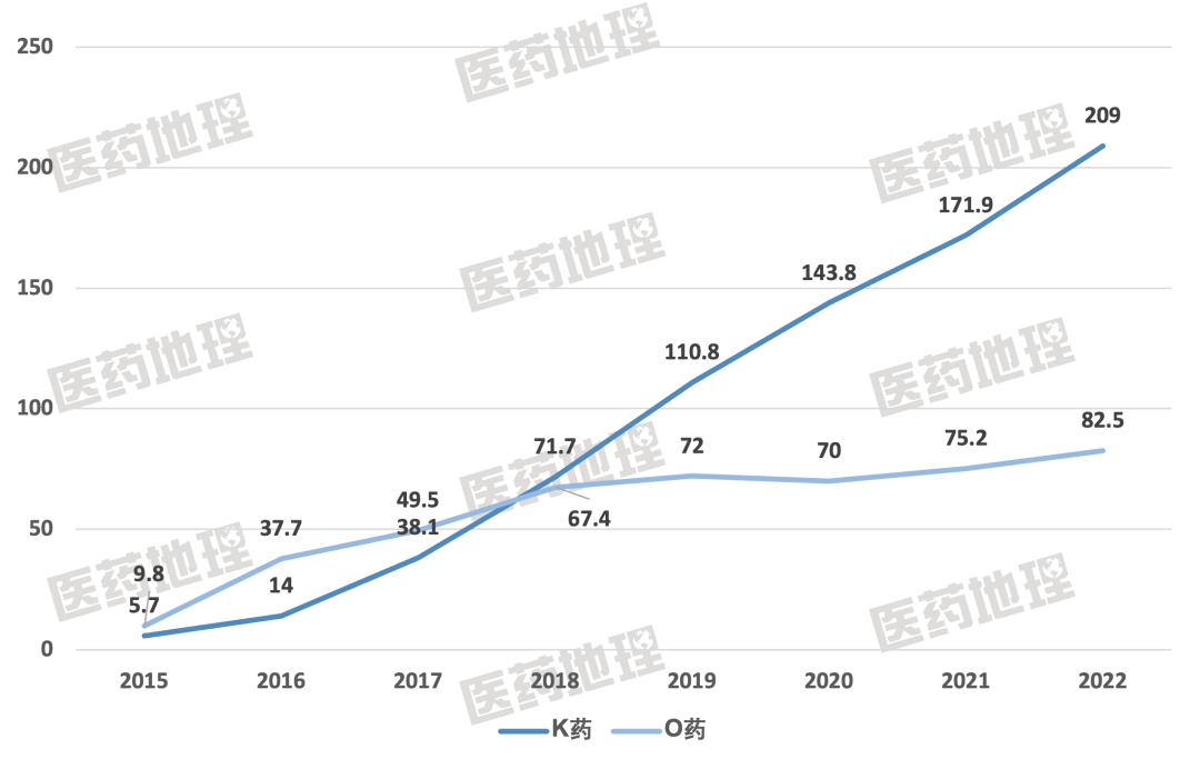相比之下,K药的老对手O药虽为全球首款上市的PD-1免疫抑制剂,其FDA获批的癌种仅11个。2022年BMS年报显示,其年销售额82.5亿美元。从Pharma ONE智能药物大数据分析平台中整理的K药于O药历年全球销售数据来看,自2018年K药销售额超过O药,K药增长趋势迅猛,这与其适应症的不断突破密切相关。