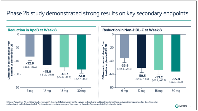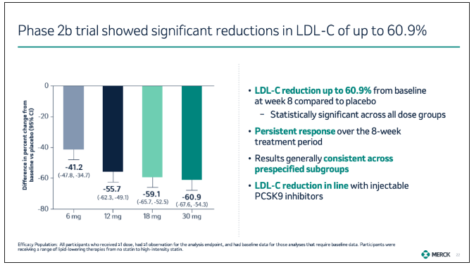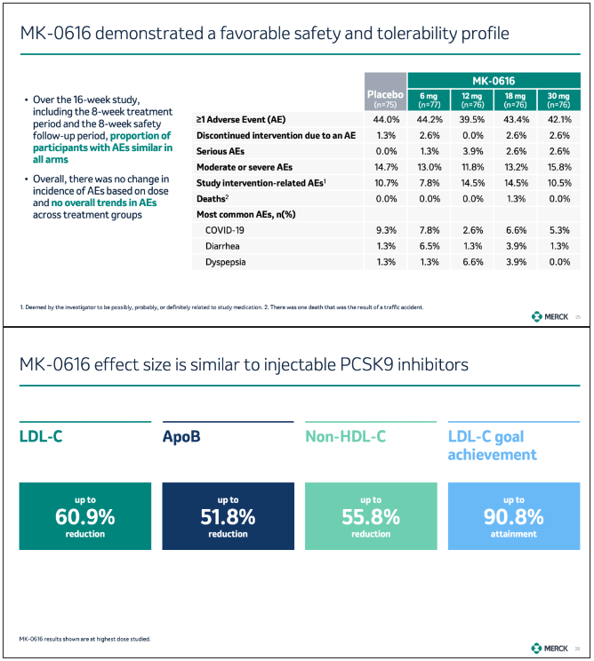 首先,默沙东披露了在研口服 PCSK9 抑制剂 MK-0616 治疗成人高胆固醇血症患者的 2b 期临床试验的积极结果,并计划于今年下半年启动 III 期关键研究。
