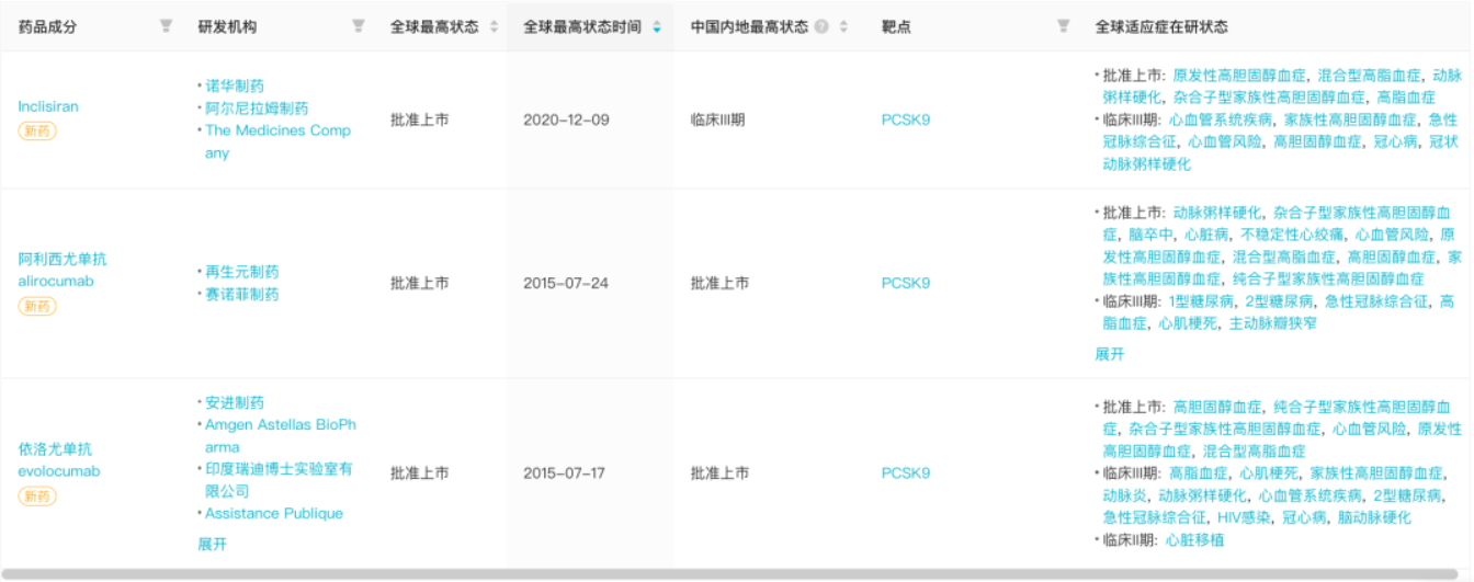 据 Insight 数据库显示,目前全球共有 3 款 PCSK9 抑制剂获批,包括两款 PCSK9 单抗,分别为赛诺菲/再生元联合研发的 Praluent(阿利西尤单抗注射液)、安进的 Repatha(依洛尤单抗注射液),以及诺华于 2019 年耗费 97 亿美金通过收购 The Medicines 获得的 siRNA 基因疗法药物 Inclisiran。