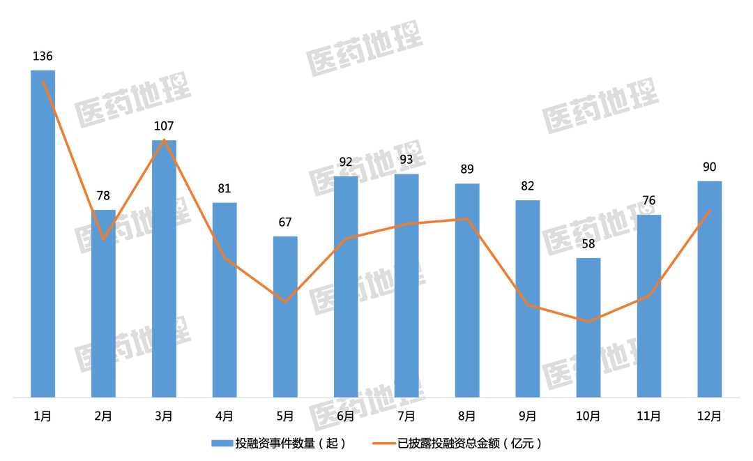 2022年,全国医疗健康领域投融资事件共1049起,已披露的投融资总金额约为1258亿元,虽较去年同期事件数量及总金额有所下降,但仍为历史高点,市场保有乐观态度。按月度来看,投融资数量和金额均有所波动,2月、5月、10月一级市场活跃度相对较低,投融资数量及金额较少。
