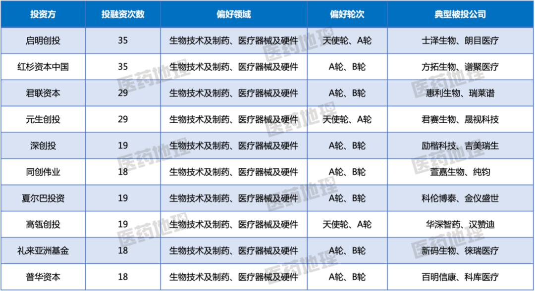 据不完全统计,2022年国内一级市场投资机构超2500家。其中,活跃的投资机构TOP10为启明创投、红杉资本中国、君联资本、元生创投等,均偏好投资早期项目,尤其关注生物技术及制药、医疗器械及硬件两个热门赛道。
