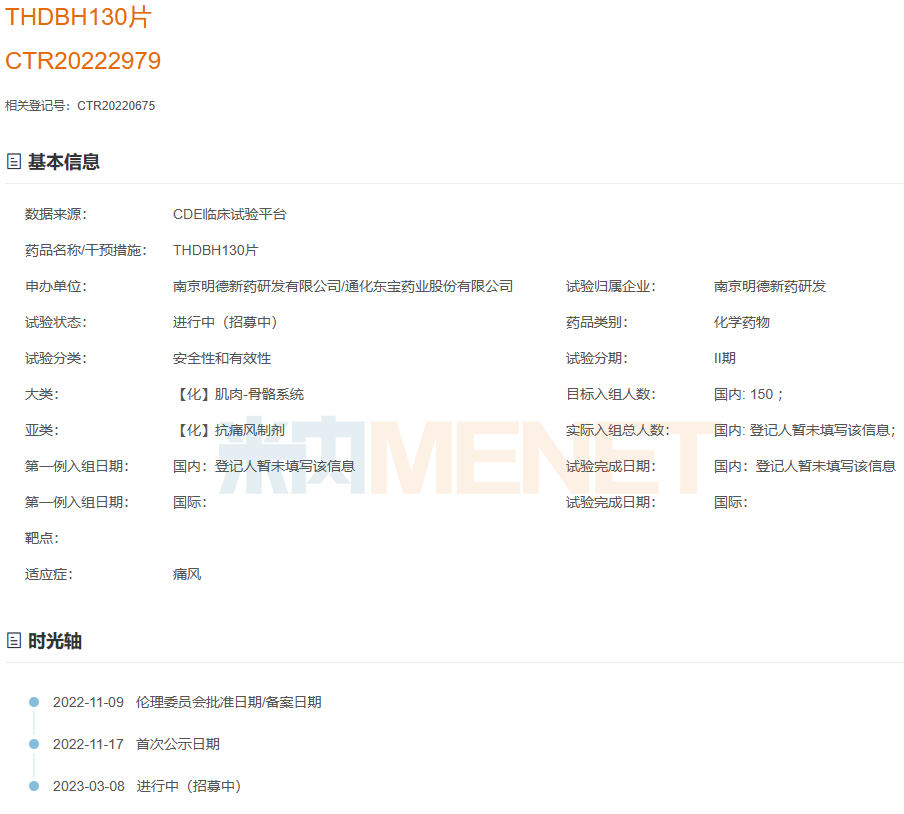 近日,通化东宝发布公告,其全资子公司东宝紫星(杭州)生物医药的化药1类新药URAT1抑制剂(THDBH130片)已经顺利完成I期临床试验,已启动中国II期临床试验,并于近日成功完成首例受试者入组。THDBH130片是一种特异性作用于尿酸排泄通路的高活性、高选择性、高安全性的尿酸转运体URAT1抑制剂,I期临床试验结果显示其具有低系统暴露、高药理学活性、餐后给药更优的降尿酸效应特点,具有良好的安全性及耐受性。