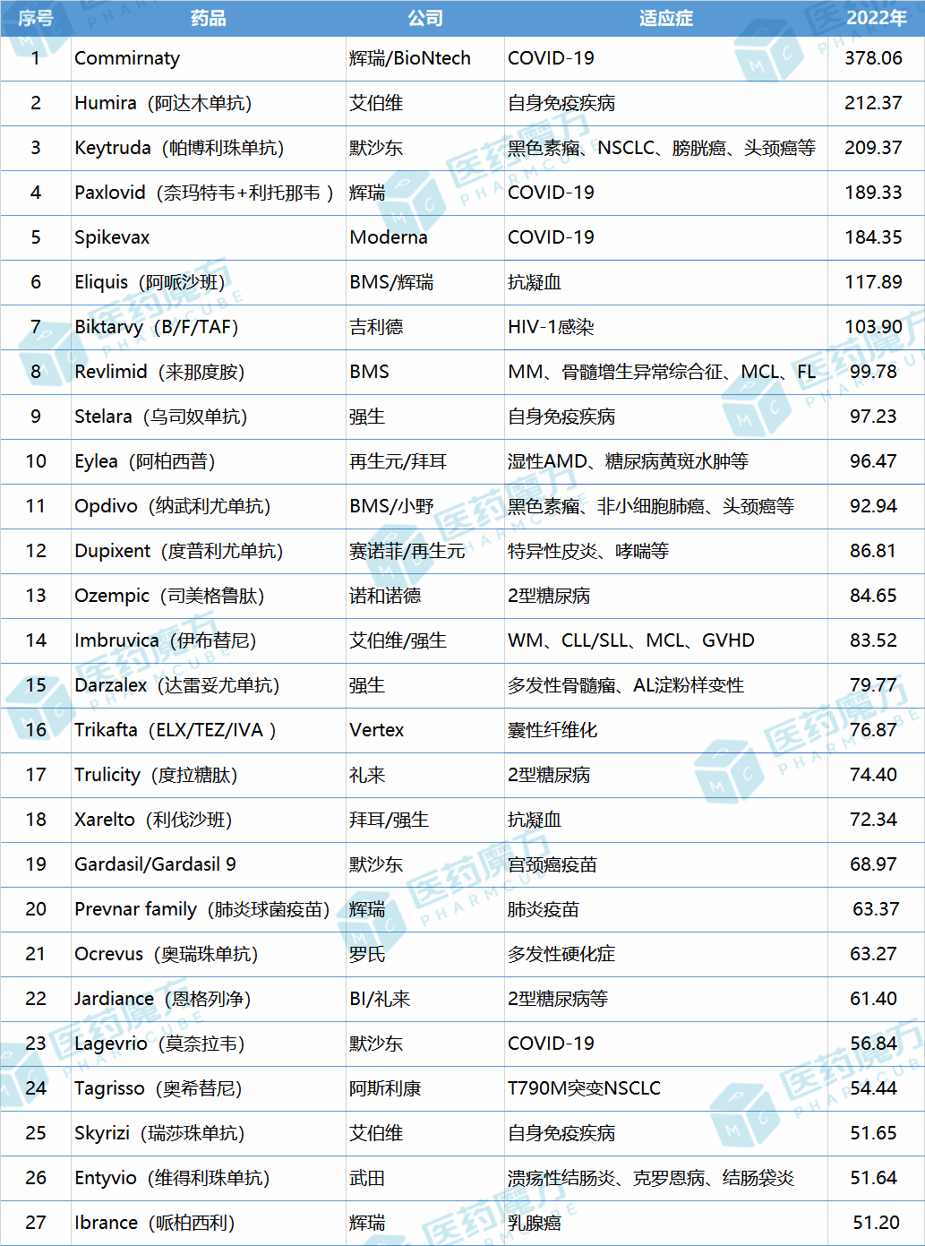 新老交替是常态,后备力量是否码足是保持领先的关键。修美乐200亿美元的传奇生涯受生物类似药以及竞品的冲击,难逆下跌趋势。不过,艾伯维早已布局自免不同靶点产品的开发,其中备受关注的IL-23抑制剂瑞莎珠单抗自2019年上市以来销量一路高涨,2022年涨幅高达76%;JAK1抑制剂乌帕替尼也以52.8%高速增至25.22亿美元。艾伯维曾预测,2027年这两款产品销售峰值将超过修美乐210亿美元的峰值收入。这27款产品取得亮眼销售表现的背后都有值得总结的开发思路。当然,每款药物也都演绎着各自不同的生命周期,用一道道不同的药品销售曲线划出各自或绚烂、或凄美的故事。2023年的50亿+美元会有怎样的变动,我们也拭目以待。