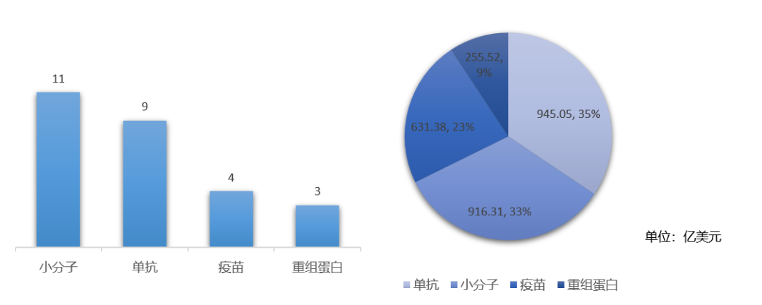 注:恩格列净为2021年数值(BI财报未出),按照礼来财报该产品的增速推测2022年依旧超过50亿美元。1)汇率换算:1美元=0.9540瑞士法郎,1美元=0.9485欧元,1美元=130.57日元;2)日本企业武田、小野为2022自然年收入从药物类型上看,50亿+美元药品中,小分子药物与单抗类药物在数量和销售额上算是平分秋色;疫苗、重组蛋白类药物共7款,其中新冠mRNA疫苗Comirnaty作为疫情特殊历史时期催生出的特殊产品,年销售额300亿+也是现象级产品了。2022年50亿+美元上药品类型的数量和收入分布