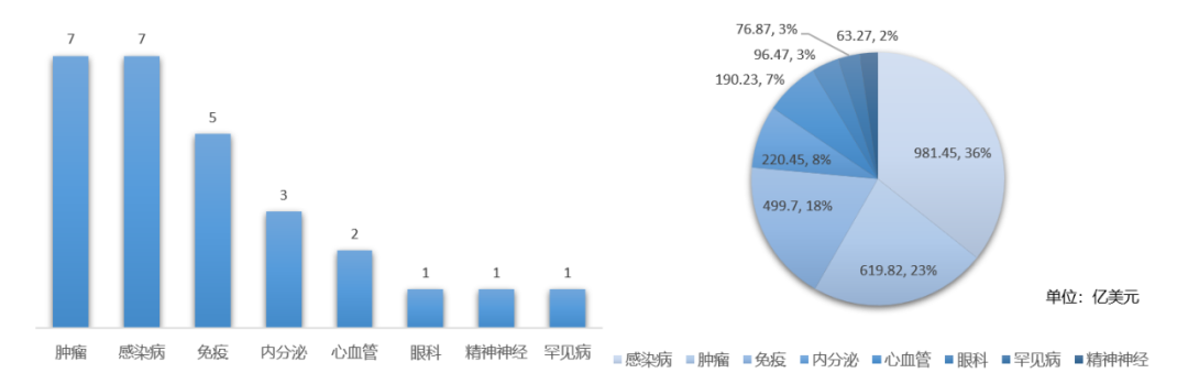2022年50亿美元以上药品疾病领域分布(数量、销售额)
