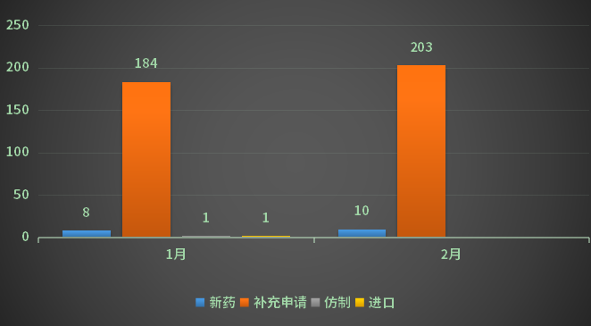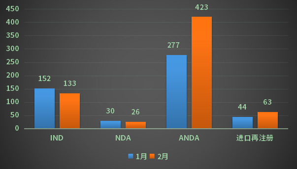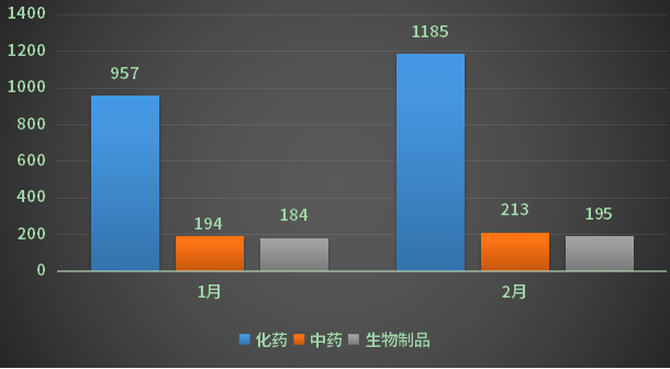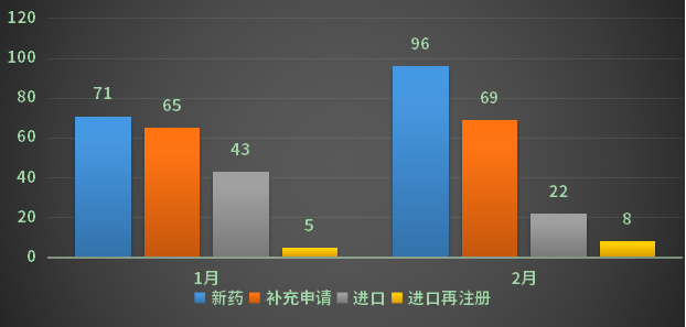 2月份CDE承办新的化药注册申请1185个(以受理号计),其中新药申请受理号129个,进口受理号98个,仿制申请受理号412个,补充申请482个,进口再注册63个;