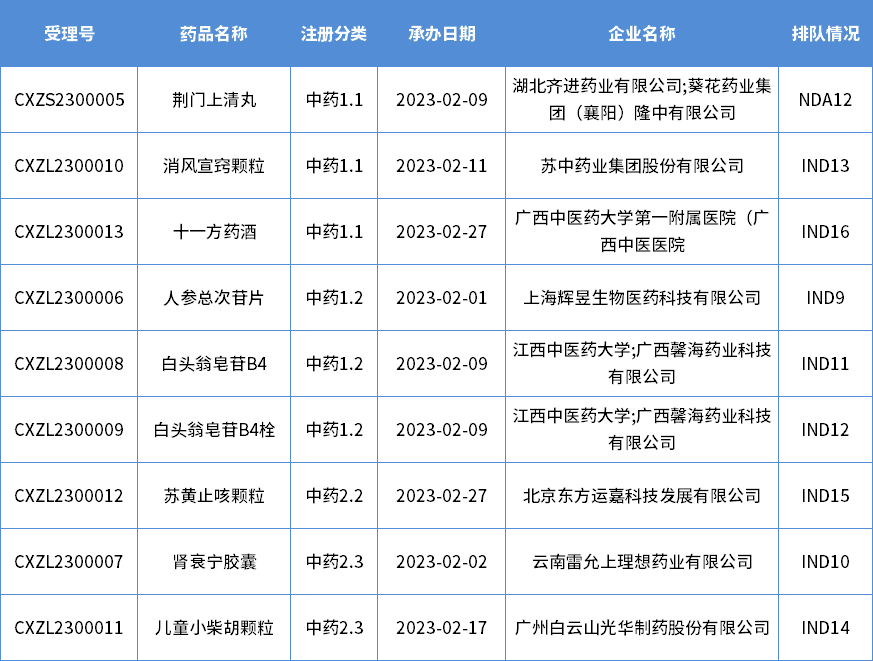 本月共承办5个中药1类创新药和3个2类改良型新药,共涉及8个品种,其中是IND申请7个,NDA申请1个;下表为2月新承办的中药新药。