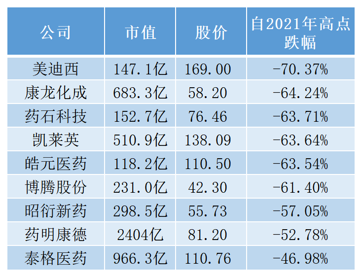 资本市场的公众情绪也进一步放大了药审改革以来的创新利好,给CXO贴上了"资本避险地"、"旱涝保收"、"集采避风港"等标签。如今,当药明康德、泰格医药、康龙化成、凯莱英、博腾股份、美迪西等行业龙头皆出现不小的降幅时,便会发现,行业寒风并非避开了CXO,只是有延迟。