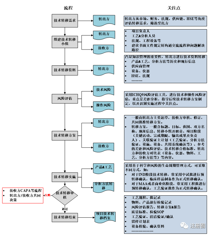 药品技术转移,首先需要确定技术转移需求,然后转出方和接收方共同组建技术转移小组,进行后续的技术资料转移、风险评估、撰写技术转移计划/方案、实施技术转移等工作,技术转移一般流程及关注点见下图1: