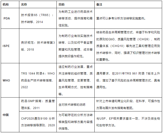 PDA、ISPE、WHO、中国等均发布了技术转移相关指导规范,相关信息汇总如下表: