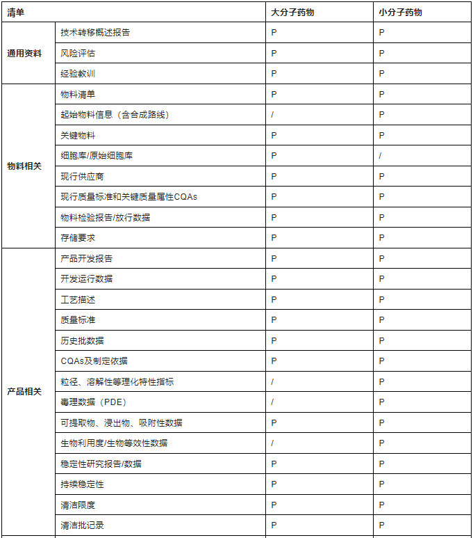 注:考虑到保密性和信息有限性,对于IND阶段,技术转移资料可以根据实际情况,评估提供,以满足临床样品制备和检验需求为最低要求。