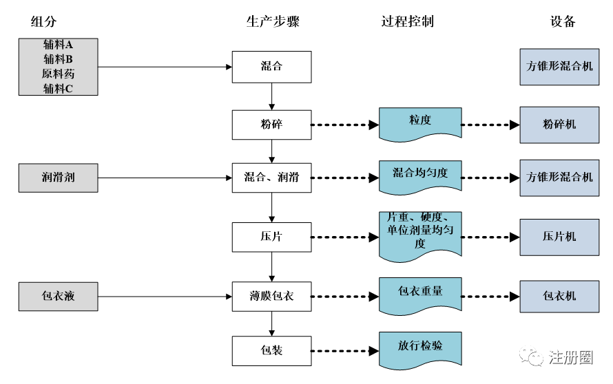 产品/工艺技术转移通常围绕,如何回答以下3个问题进行:1)当前的工艺/产品是什么?2)基于任何与新场地相关的限制因素/标准,期望的最终产品/工艺是什么? 3)为了证明产品准确、工艺稳健,需要进行什么样的支撑性工作?推荐采用框图流程图(含组分、生产步骤、过程控制、设备等),对待转移产品及工艺进行可视化呈现,便于接收方增强理解,如某片剂产品/工艺转移的框图流程图示例如下: