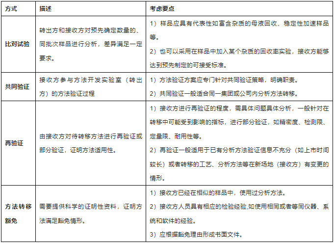 定性分析方法如外观、IR鉴别等一般无需进行方法转移,通过培训即可,定量方法如含量、有关物质、溶出度等,一般需要进行方法转移,方法转移类型主要有比对试验、共同验证、再验证、转移豁免等四类,其中比对试验是最常用的方式,分析方法转移常见类型及考虑要点见下表3: