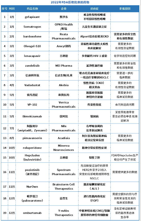 3、《年度盘点:2022年19款药物遭FDA拒批;涉及默沙东、吉利德》药智头条,2023年1月19日