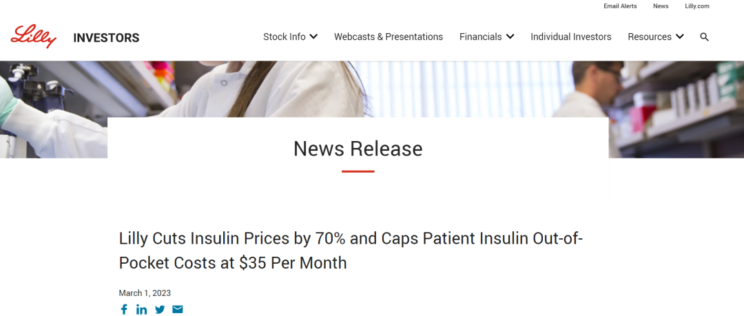 3月1日(周三),礼来(Eli Lilly)宣布,常用胰岛素价格将降低70%。礼来还表示将扩大其胰岛素价值计划,患者自付胰岛素费用每个月不超过35美元。美国总统赞扬这是“一件大事”,并鼓励其他制造商效仿。