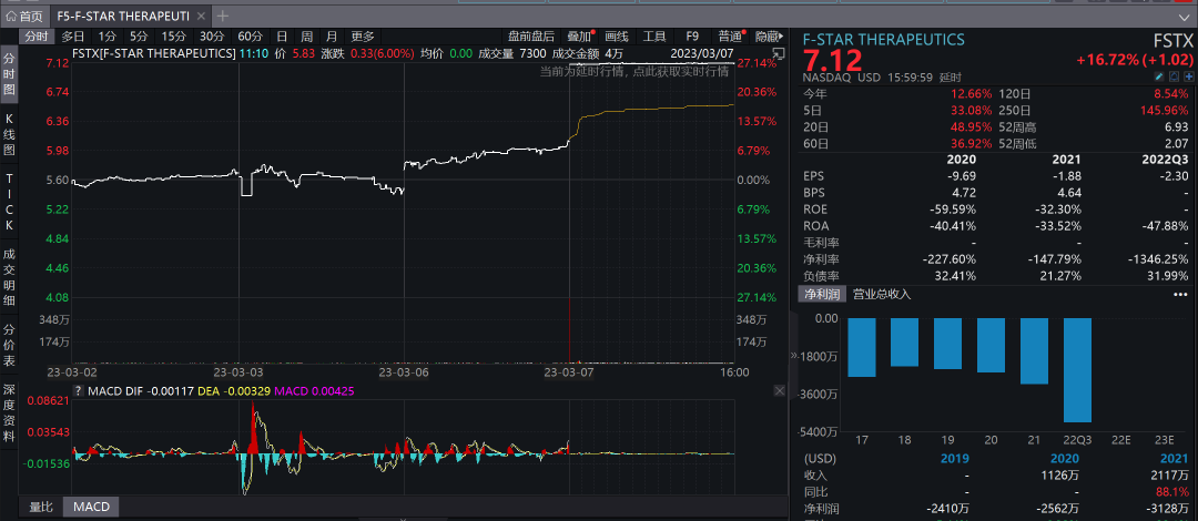 截至2023年3月7日美股收盘,F-Star Therapuetics的股价大涨16.72%至7.12美元/股。