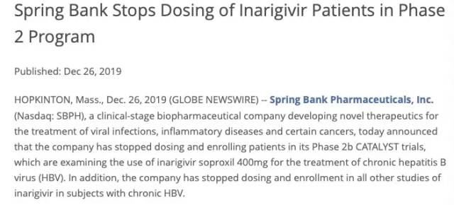 2019年12月26日,Spring Bank发布公告称,已经停止正在进行的Phase 2b期 CATALYST临床试验的受试者入组和用药工作,该项试验是评估 400 mg inarigivir soproxil(SB-9200)在病毒已经被抑制的慢乙肝患者中安全性和效用的研究。