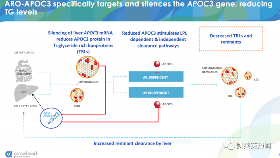 ApoC-III是甘油三酯代谢的关键调节剂,存在于富含甘油三酯的脂蛋白TRL中,包括乳糜微粒和VLDL。ARO-APOC3特异性靶向和沉默APOC-III mRNA,减少肝脏内apoC-III的生成,使VLDL和乳糜微粒残留物更好地清除。