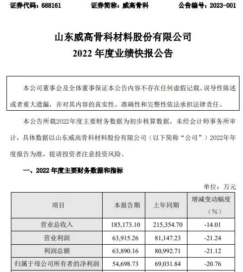 由于新冠疫情影响,骨科终端手术量减少,对整体业绩造成一定影响。今年二月底,威高股份公布年度业绩快报。数据显示,报告期内公司实现营业收入185,173.10万元,较上年同期下滑14.01%;实现归属于母公司所有者的净利润54,698.73万元,较上年同期下滑20.76%。