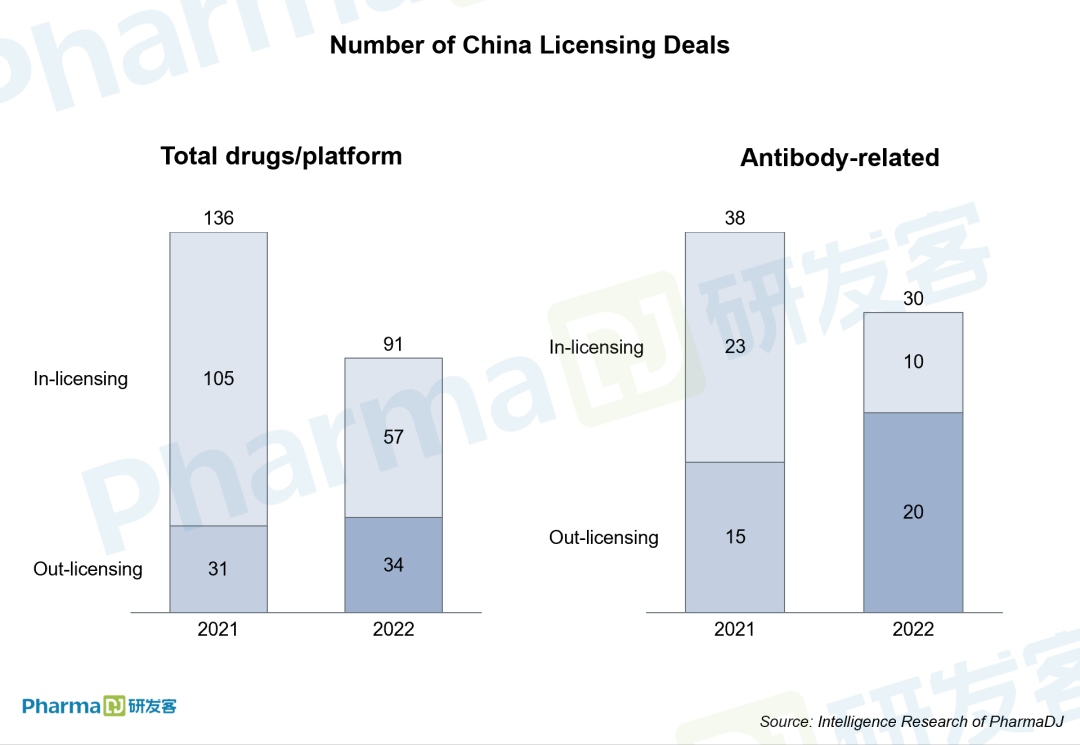 与整体交易情况相同,尽管2022年的交易数量相比2021年有明显下降,但在抗体相关的授权交易占比有所提升(27.9%至33.0%)。