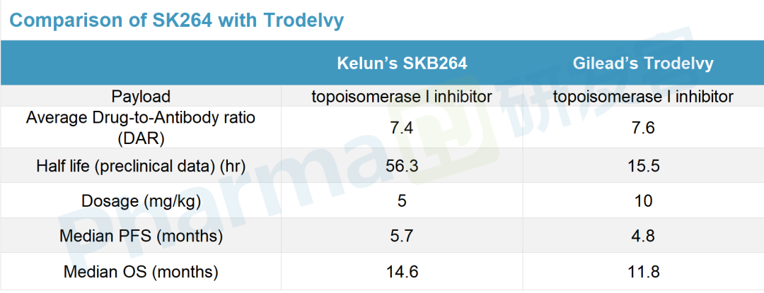 SKB264 是使用2-甲基磺酰基嘧啶作为linker结合belotecan衍生物拓扑异构酶 I 抑制剂开发而成。尽管没有SKB264与吉利德的同机制产品Trodelvy的头对头临床试验比较结果,但初步的临床数据表明SKB264是更好的Trop2 ADC。