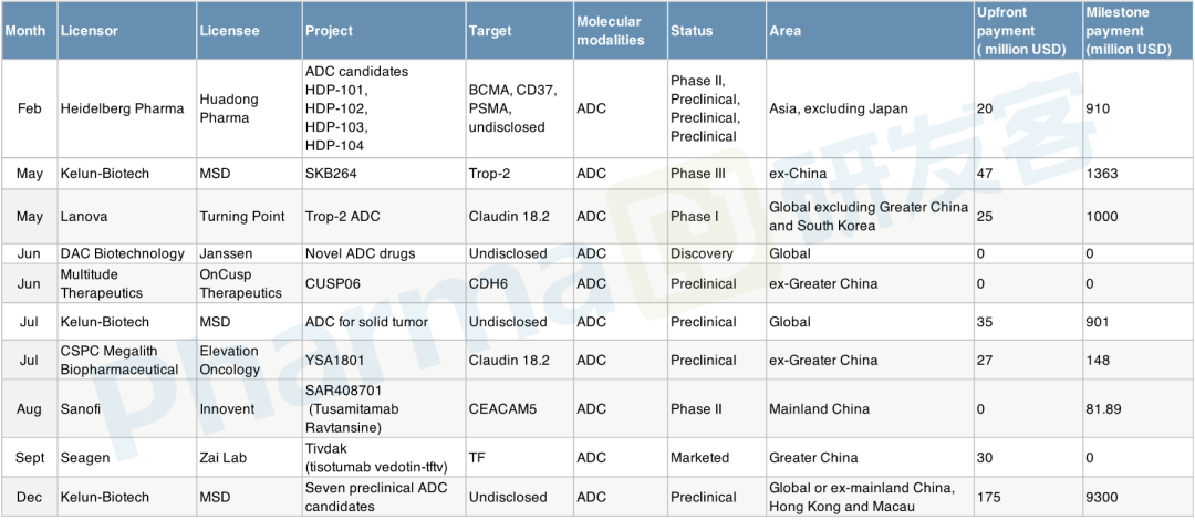 2022年国内外公司达成的全部ADC产品相关的授权协议如下: