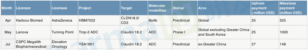 2022年国内药企共达成了3个针对靶向Claudin18.2抗体的对外授权交易。