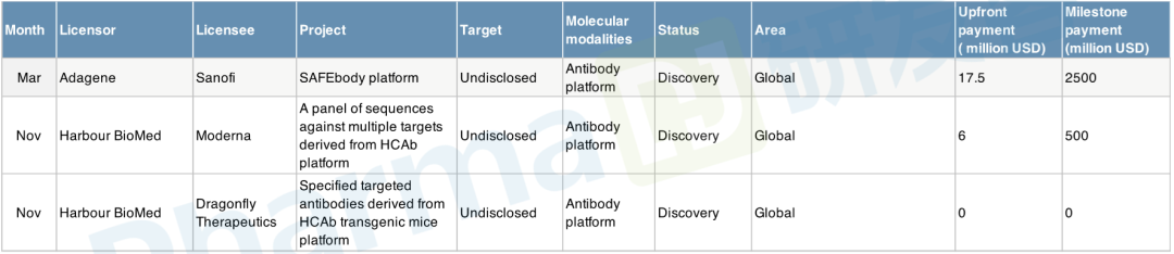 在产品对外授权的基础上,去年还出现了3个抗体技术平台的对外授权交易。