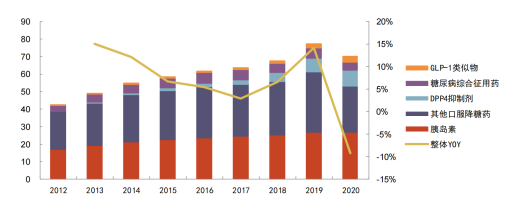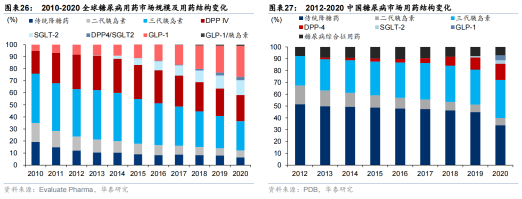 国内方面,二代胰岛素占比较为平稳,三代胰岛素、传统降糖药占比最高,而三代胰岛素和拥有剂型创新优势的DPP-4抑制剂的占比在不断提高。