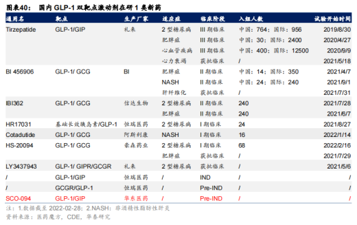 除了口服GLP-1药物以外,全球还有多款GLP-1双靶点激动剂在研,包括礼来的Tirzepatide,其中治疗2型糖尿病已经于5月13日获得FDA批准上市,肥胖症(III期)、心血管疾病(III期)、心力衰竭(获批临床)等多项适应症在研;BI公司的BI456906,在研适应症包括肥胖症、NASH,均已处于II期临床。