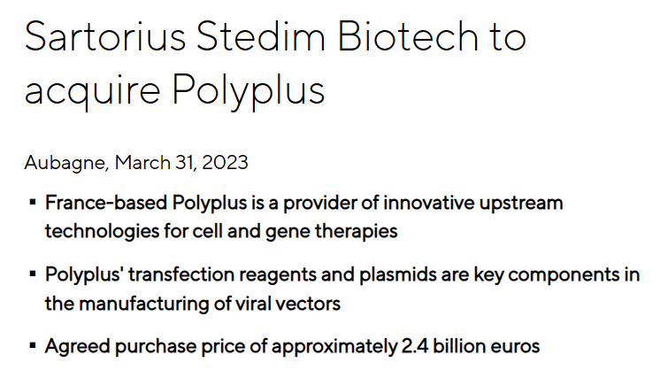 3月31日,赛多利斯旗下子公司Sartorius Stedim Biotech宣布,将以24亿欧元(约合26亿美元)从私人投资者ARCHIMED和WP GG Holdings IV手中收购细胞基因治疗(CGT)创新上游技术供应商Polyplus。这项交易预计将在今年第3季度完成。