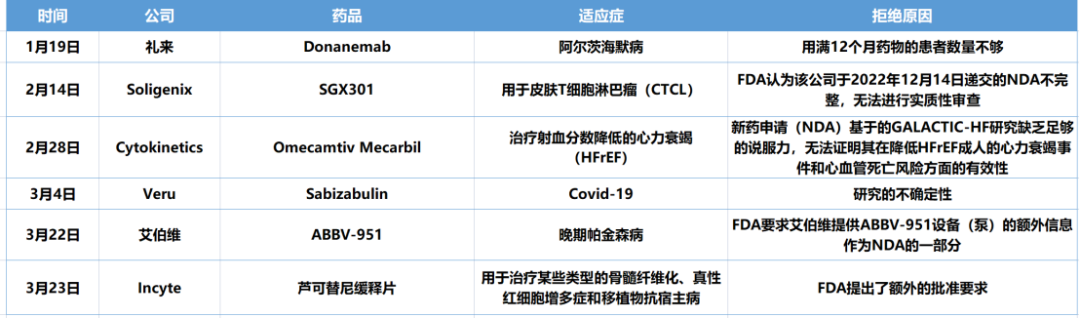 2023年1季度,有6款新药上市申请收到了FDA发出的完整回复函(CRL),而被拒理由绝大多数集中于对产品有效性和安全性的质疑上,包括临床获益存疑、临床数据单一等问题。