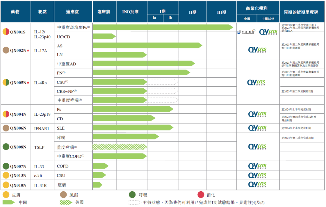 IL靶点的多元化覆盖是荃信生物管线的最大亮点。先来看生物类似药资产,IL-12/23双靶向的QX001S是荃信生物管线中进展最快的一款生物制剂,不仅获得华东医药的青睐助力商业化进程,也有望拔得头筹,成为国内首款上市的乌司奴单抗生物类似药。2022年,乌司奴单抗原研已逼近百亿美元营收。对于biotech而言,通过率先商业化生物类似药来打通自我造血能力,算是公司运营战略的上策。荃信生物在创新药上的布局更为丰富,通过IL-17A单抗QX002N、IL-23单抗QX004N、IL-4Rα单抗QX005N和IL-33单抗QX007N四款抗体,将时下最具市场确定性的IL靶点一网打尽,全面拓展强直性脊柱炎、斑块状银屑病、克罗恩病、特应性皮炎和哮喘等疾病版图。目前,IL-17A单抗QX002N和IL-4Rα单抗QX005N都已推进至II期临床阶段,QX007N有望成为首个进入临床的国产IL-33单抗。荃信生物的管线布局并不局限于IL靶点,QX006N单抗以IFNAR1靶标,发力系统性红斑狼疮。IFNAR1赛道竞跑者甚少,全球范围内仅有阿斯利康开发的Saphnelo撞线,国内布局该靶点的药企仅有两家。TSLP单抗QX008N是荃信生物在呼吸系统自免疾病领域布局的另一力作,目前仅有阿斯利康/安进首创的Tezspire攻克TSLP壁垒。细品之下,荃信生物在自免领域的差异化布局让人眼前一亮。首先,荃信生物在仿创结合之路中逐渐领跑国内IL-12/23赛道,有望凭先发优势抢占市场;其次,通过多元布局IL系列靶点,开发丰富且高度协同的自免适应症,构筑产品竞争壁垒;最后,以相对小众的IFNAR1与TSLP靶点作为自免领域的有力补充,打造产品的差异化优势。