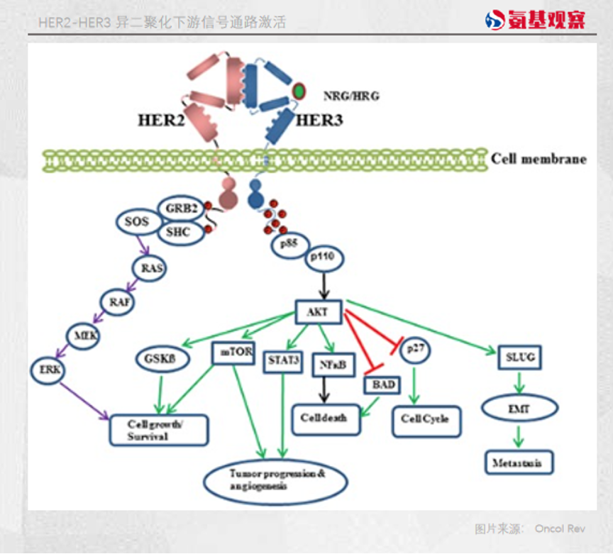 尤其是当HER3与HER2两兄弟接上头,变会形成HER2:HER3异源二聚体,导致PI3K/AKT和MEK/MAPK信号通路会被激活,促进细胞的分裂、增殖与分化,促进癌细胞的存活和发展。