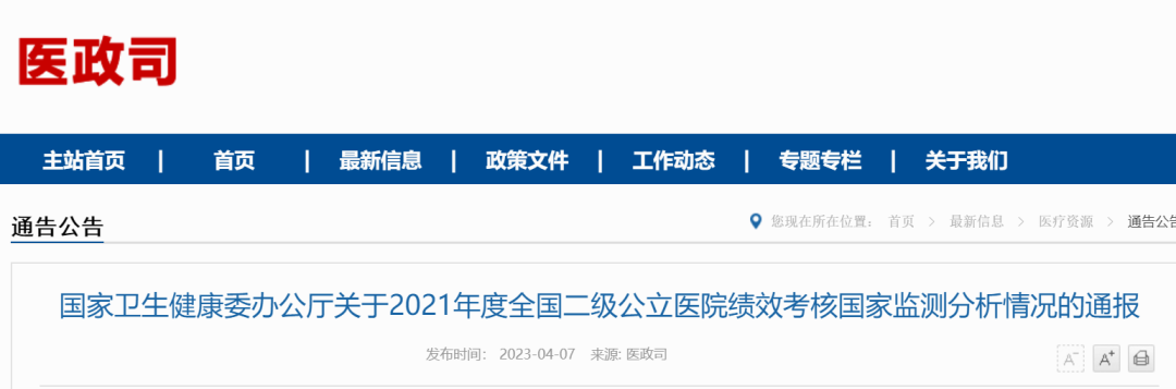 近日,国家卫健委发布《关于2021年度全国二级公立医院绩效考核国家监测分析情况的通报》。