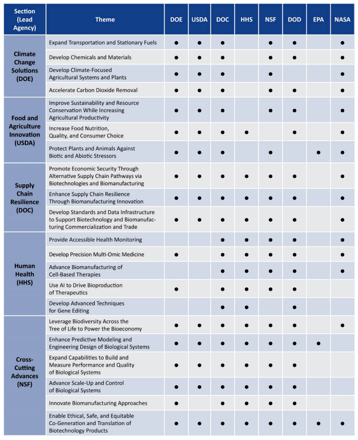 其中涵盖了“解决气候变化问题”、“增强粮食和农业创新”、“提高供应链弹性”、“促进人类健康”以及“推进交叉领域发展”五大部分,包含21个主题与49个具体目标,突出了生物技术和生物制造的无限可能性。