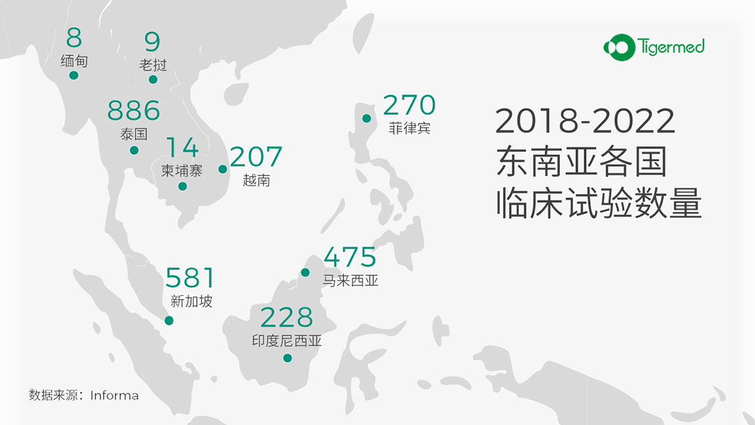 在各国带动下,东南亚地区创新药产业发展持续加快,临床研发能力迅速提升。根据Informa数据,整个东南亚地区,2018-2022年每年新增临床试验数量400个以上,年复合增长率1.9%。其中,4年间泰国临床试验数量达到886个,位居地区首位,新加坡和马来西亚分别为581个和475个,菲律宾、印尼和越南位居第三梯队,临床试验数量分别达到270个、228个和207个。