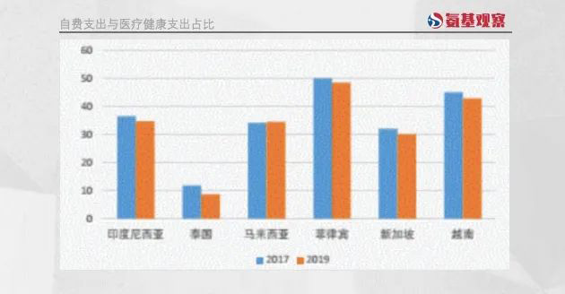 其次,东南亚的支付能力也在跟上节奏。一方面,东南亚国家全民健康覆盖比例不断提升,各国之间自费水平有较大差异,但随着政府对于报销力度的加大,自费比例在逐渐下降。如下图所示,泰国目前自费支出占比已经不到10%。