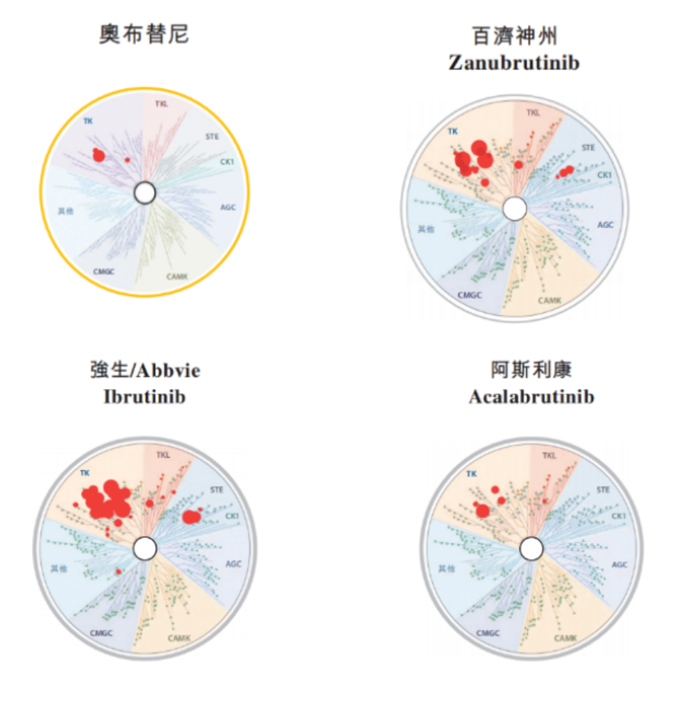 奥布替尼与其他已上市三种BTK抑制剂结合的激酶在激酶组树上的对比