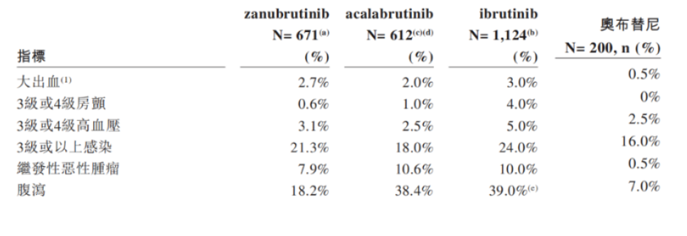 其二是已有临床毒性数据的对比,奥布替尼的副反应发生率低于伊布替尼、阿卡替尼和泽布替尼,患者耐受性较好(下图数据缺点在于奥布替尼样本量低于其他三个)。