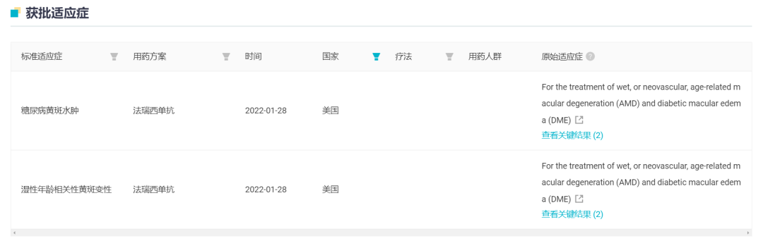 据 Insight 数据库显示,在海外,法瑞西单抗共有 2 项适应症获批上市,分别治疗湿性年龄相关性黄斑变性(AMD)和糖尿病黄斑水肿(DME)。这两项适应症在国内的 III 期临床研究也早已在 2021 年度完成招募,罗氏去年下半年和本周申报的两项适应症应该就与之对应。
