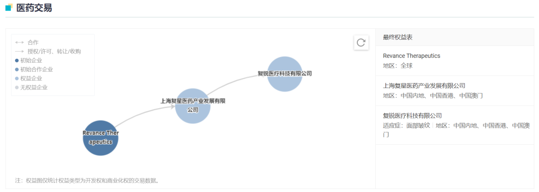 复星医药最初在 2018 年 12 月获 Revance 公司授权在中国大陆、香港及澳门特别行政区独家使用、进口、销售及其他商业化(不包括制造)。2021 年 7 月,复星医药又宣布已与旗下医美子公司复锐医疗科技订立再许可协议,授权该公司开发及商业化 RT002 美容适应症(包括但不限于中到重度眉间纹)。