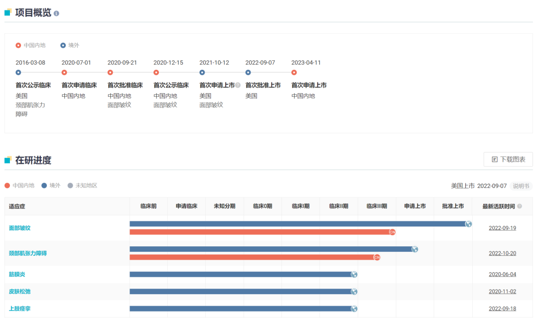 据 Insight 数据库显示,该新药的主要适应症包括美容适应症(如治疗中重度眉间纹)和治疗适应症(如颈部肌张力障碍),此前在国内都启动了 III 期临床。前者临床试验已完成,也已在海外获 FDA 批准上市,因此本次申报的适应症大概率为中重度眉间纹。