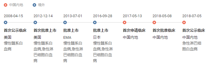 早在 2012 年末,该药就在美国获批上市,2013 年度和 2016 年度又分别在欧洲和日本获批。在中国,其首项临床申请在 2017 年递交,于 2018 年 7 月首次公示临床。此前由于国内三代 BCR-ABL 抑制剂的空白,该药曾被纳入第一批临床急需境外新药名单,本周终于申报上市。