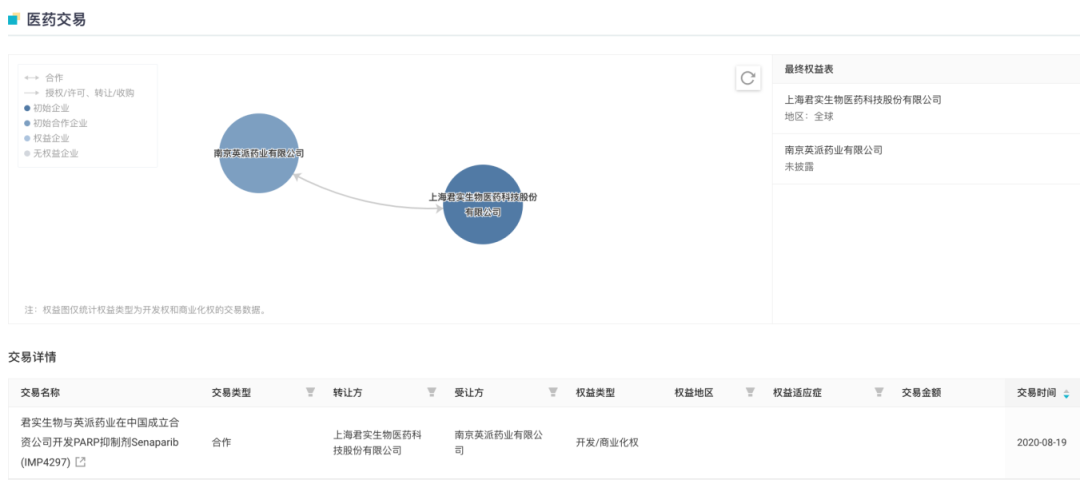 2020 年 8 月,君实生物与英派药业就成立合资公司订立合资协议。合资公司将主要从事含 Senaparib 在内的小分子抗肿瘤药物研发和商业化,英派药业将注入资产 Senaparib 在合资区域内(中国大陆及香港、澳门特别行政区)的权益,君实生物和英派药业将分别拥有合资公司的 50% 股权。