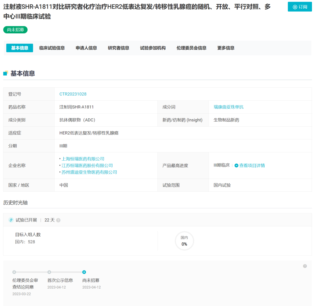 4 月 12 日,Insight 数据库显示,恒瑞 HER2 ADC 瑞康曲妥珠单抗启动了第 2 项 III 期临床试验,针对 HER2 低表达乳腺癌。此前在 2022 年 6 月,瑞康曲妥珠单抗首次进入临床 III 期阶段,首个适应症为 HER2 阳性乳腺癌。