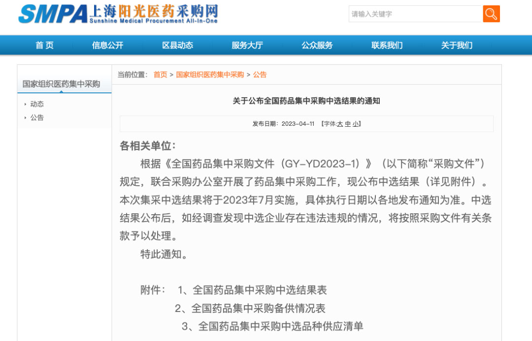 官网发布的文件包括:全国药品集中采购中选结果表、全国药品集中采购备供情况表、全国药品集中采购中选品种供应清单。