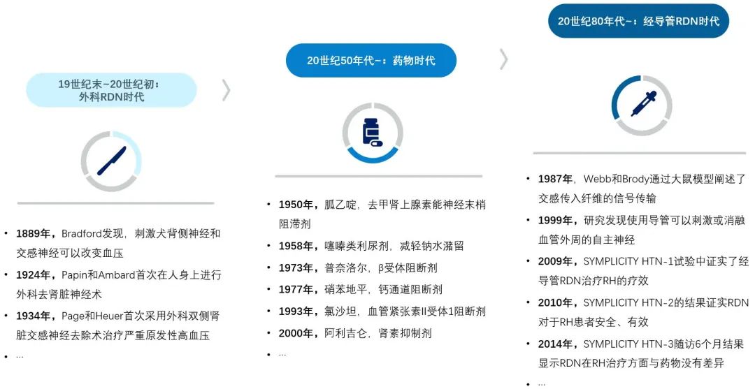 传统疗法难以满足临床需求,亟待行之有效、安全微创的非药物降压治疗手段。尽管外科手术的方式逐渐失去优势,最终彻底摒弃,但其临床上初步证实了肾脏交感神经切除术在血压控制上的有效性。随着血管介入微创技术快速发展,外科手术去交感神经的治疗方法焕然一新,最终演变为了经导管肾交感神经消融术(Renal Denervation,RDN),现代化的治疗目标致力于通过微创的消融手段规避外科手术带来的各种副作用,同时具备长效性、持续性的降压获益,以达到优于药物治疗的疗效。